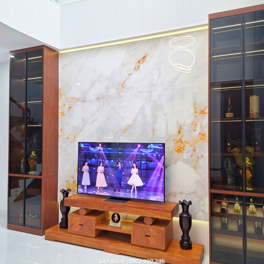 Công trình nội thất phòng khách tại Rạch Giá – Kiên Giang được thi công với rất nhiều hạng mục và sản phẩm khác nhau như vách trang trí, tủ rượu, tủ trang trí pvc vân đá, tủ cầu thang, lam sóng,… tất cả đều được Cát Biển trực tiếp thiết kế, sản xuất và thi công bằng chất liệu gỗ công nghiệp An Cường MDF chống ẩm mốc. Từng chi tiết đều được đội ngũ kĩ thuật chăm chút tỉ mỉ với mong muốn đem đến sản phẩm chất lượng nhất đến quý khách hàng!