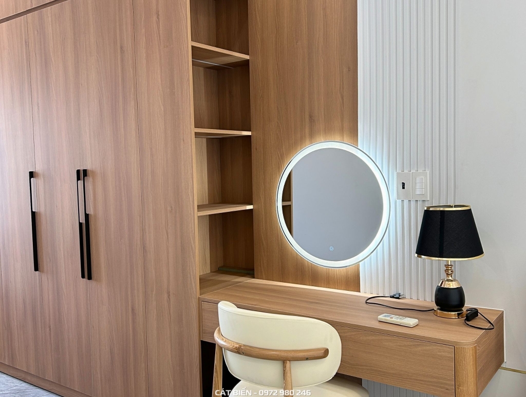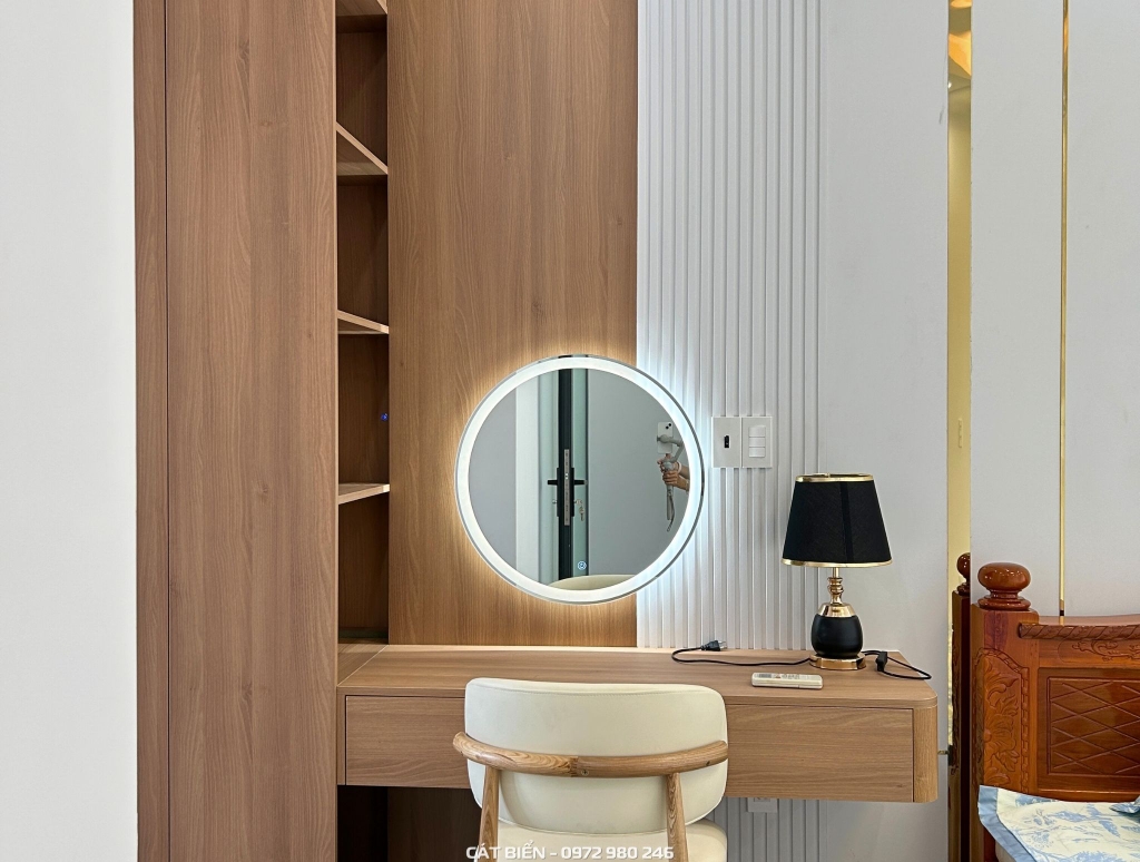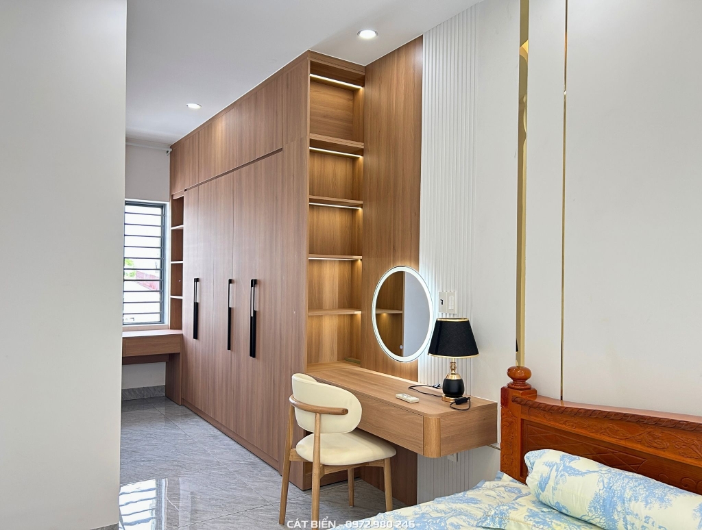 Công trình nội thất phòng ngủ tại U Minh Thượng - Kiên Giang được thi công với rất nhiều hạng mục và sản phẩm khác nhau như tủ quần áo, vách trang trí lam sóng, bàn trang điểm, tủ đầu giường… tất cả đều được Cát Biển trực tiếp thiết kế, sản xuất và thi công bằng chất liệu gỗ công nghiệp MDF An Cường lõi xanh chống ẩm mốc. Từng chi tiết đều được đội ngũ kĩ thuật chăm chút tỉ mỉ với mong muốn đem đến sản phẩm chất lượng nhất đến quý khách hàng!