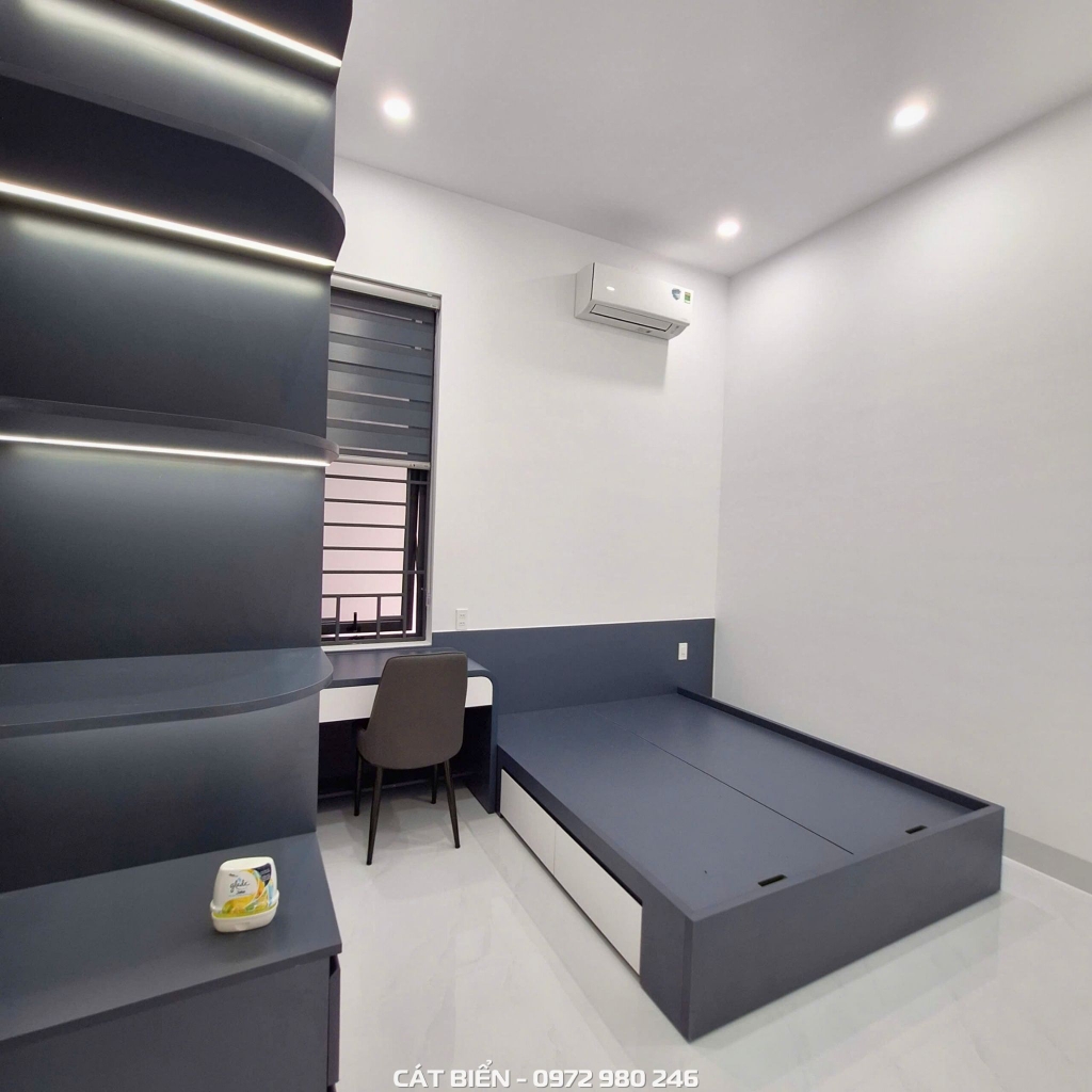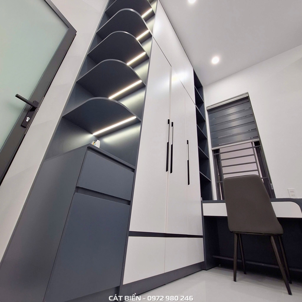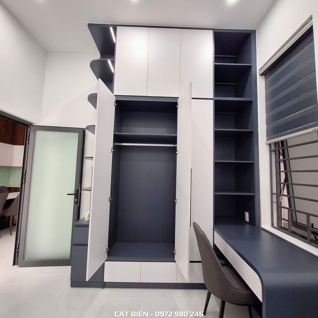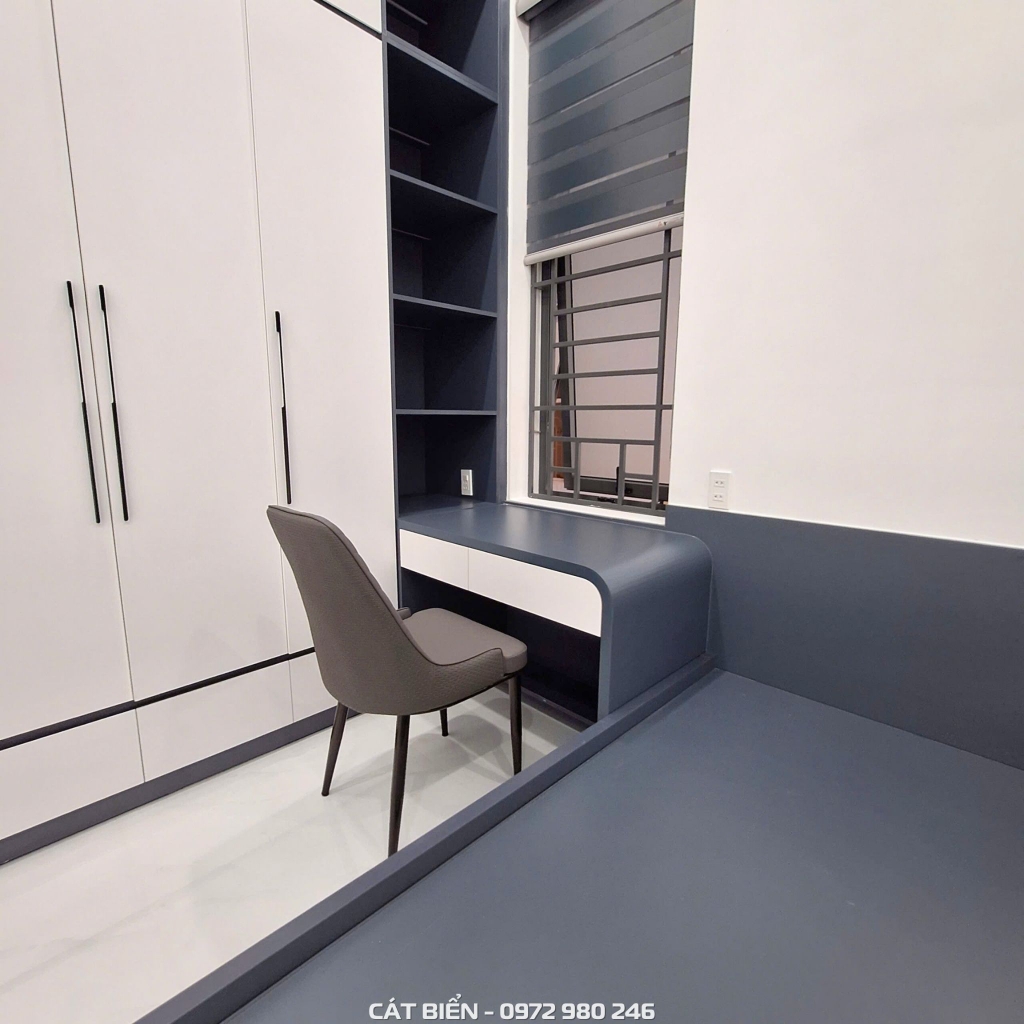 Công trình nội thất phòng ngủ tại Hòn Đất - Kiên Giang được thi công với rất nhiều hạng mục và sản phẩm khác nhau như tủ quần áo, giường ngủ, tủ đầu giường, bàn học làm việc… tất cả đều được Cát Biển trực tiếp thiết kế, sản xuất và thi công bằng chất liệu gỗ công nghiệp MDF An Cường lõi xanh chống ẩm mốc