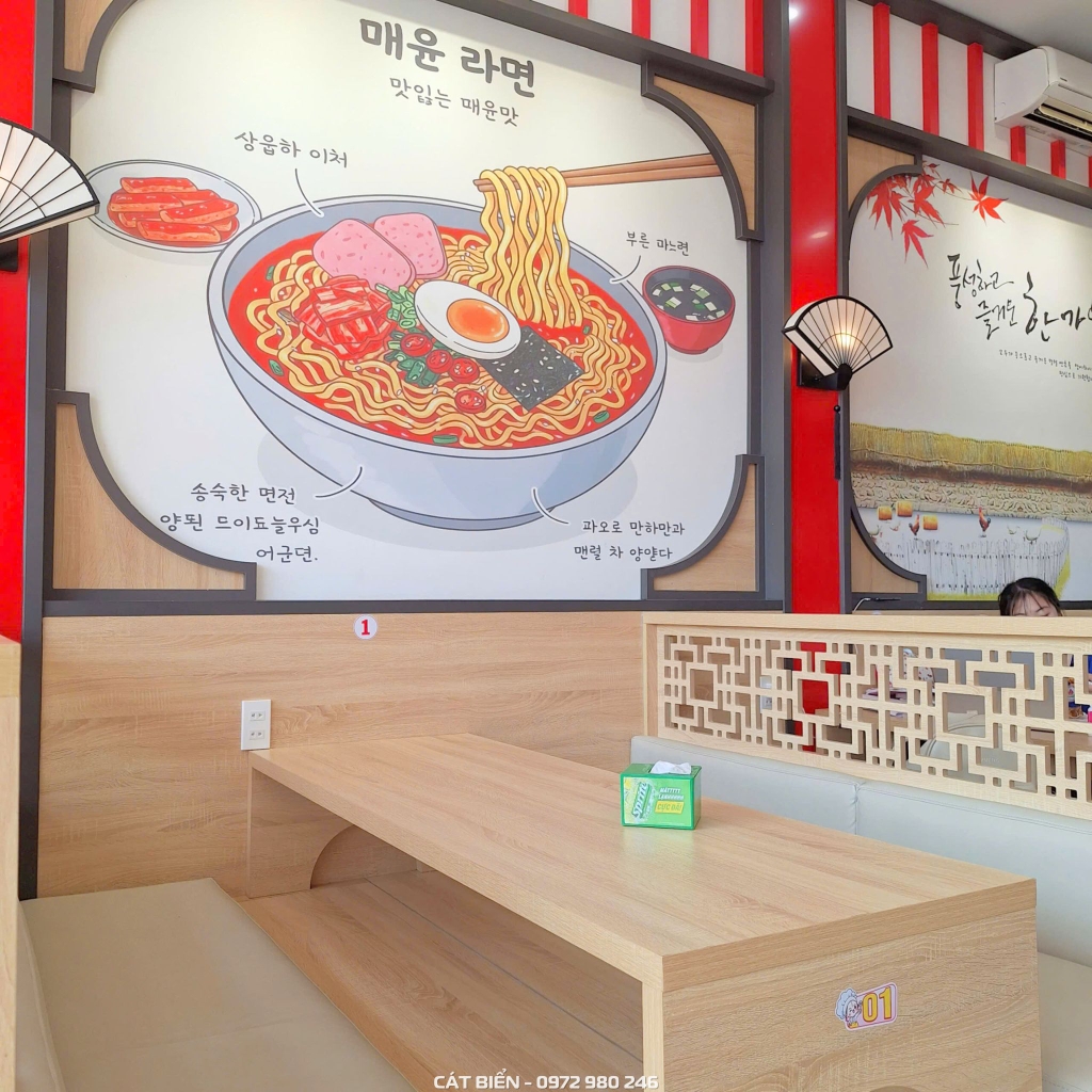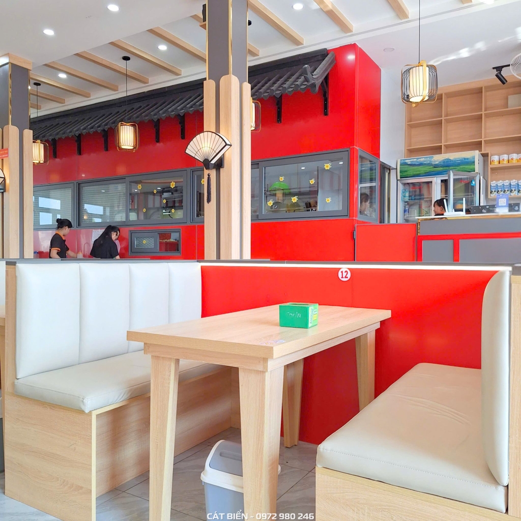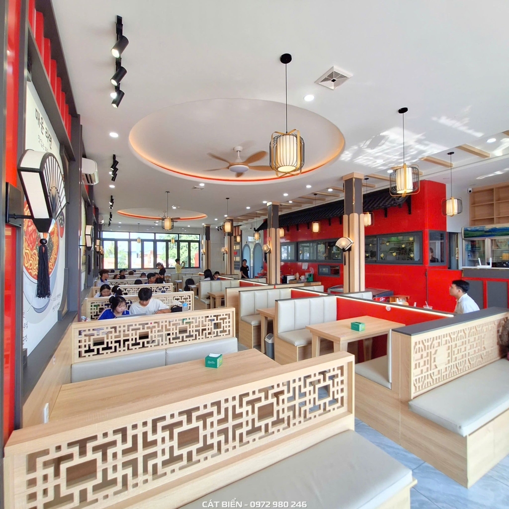Không gian quán được thiết kế với tông màu đỏ đặc trưng kết hợp cùng màu gỗ sáng, tạo nên sự cân bằng giữa nét năng động và cảm giác ấm cúng. Các chi tiết trang trí mang hơi hướng Á Đông như hệ đèn lồng, vách trang trí và tranh tường chủ đề mì cay giúp không gian trở nên sinh động và tạo điểm nhấn rõ nét cho thương hiệu. Hệ bàn ghế được bố trí dạng booth ngồi, vừa tối ưu diện tích vừa mang lại sự thoải mái và riêng tư cho khách hàng khi thưởng thức món ăn.